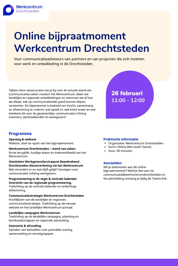Op 26 februari organiseert Werkcentrum Drechtsteden een online bijpraatmoment. Dit is bedoeld voor communicatieadviseurs van partners en van projecten die zich inzetten voor werk en ontwikkeling in de Drechtsteden. Aanmelden kan via: communicatie@werkcentrumdrechtsteden.nl.