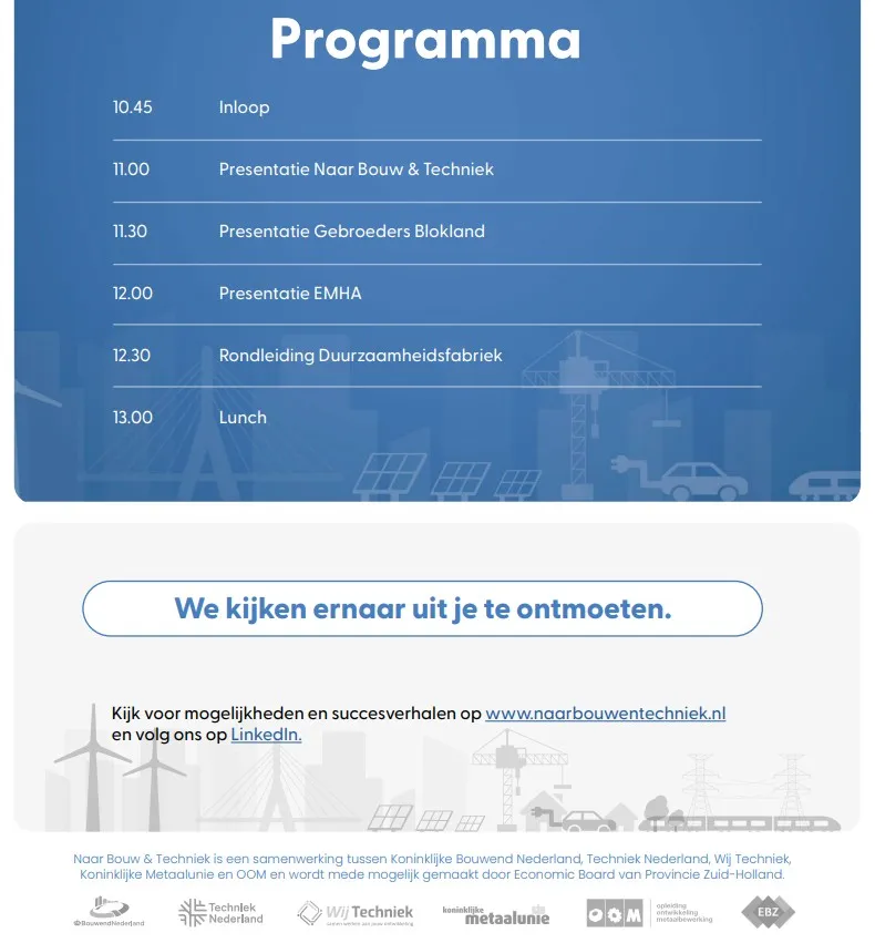 Meld je aan via info@naarbouwentechniek.nl en geef je naam en contactgegevens