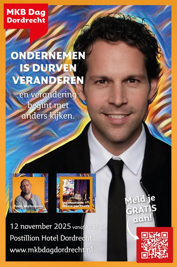 Voor het volledige programma en om je (gratis) in te schrijven, verwijzen we je door naar de website: www.mkbdagdordrecht.nl. Of meld je aan via onderstaande QR-code. Graag tot 12 november!