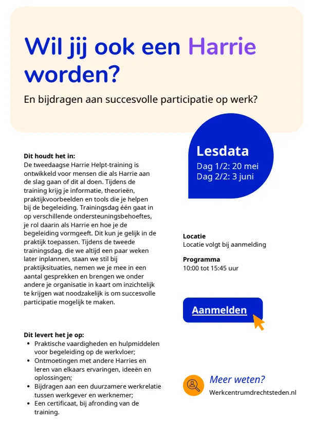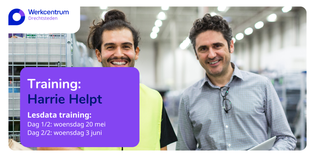Harrie Helpt is er voor mensen die een stapje harder willen lopen voor een collega met een ondersteuningsbehoefte. Wil jij ook een Harrie worden? En bijdragen aan succesvolle participatie op werk? Meld je aan!